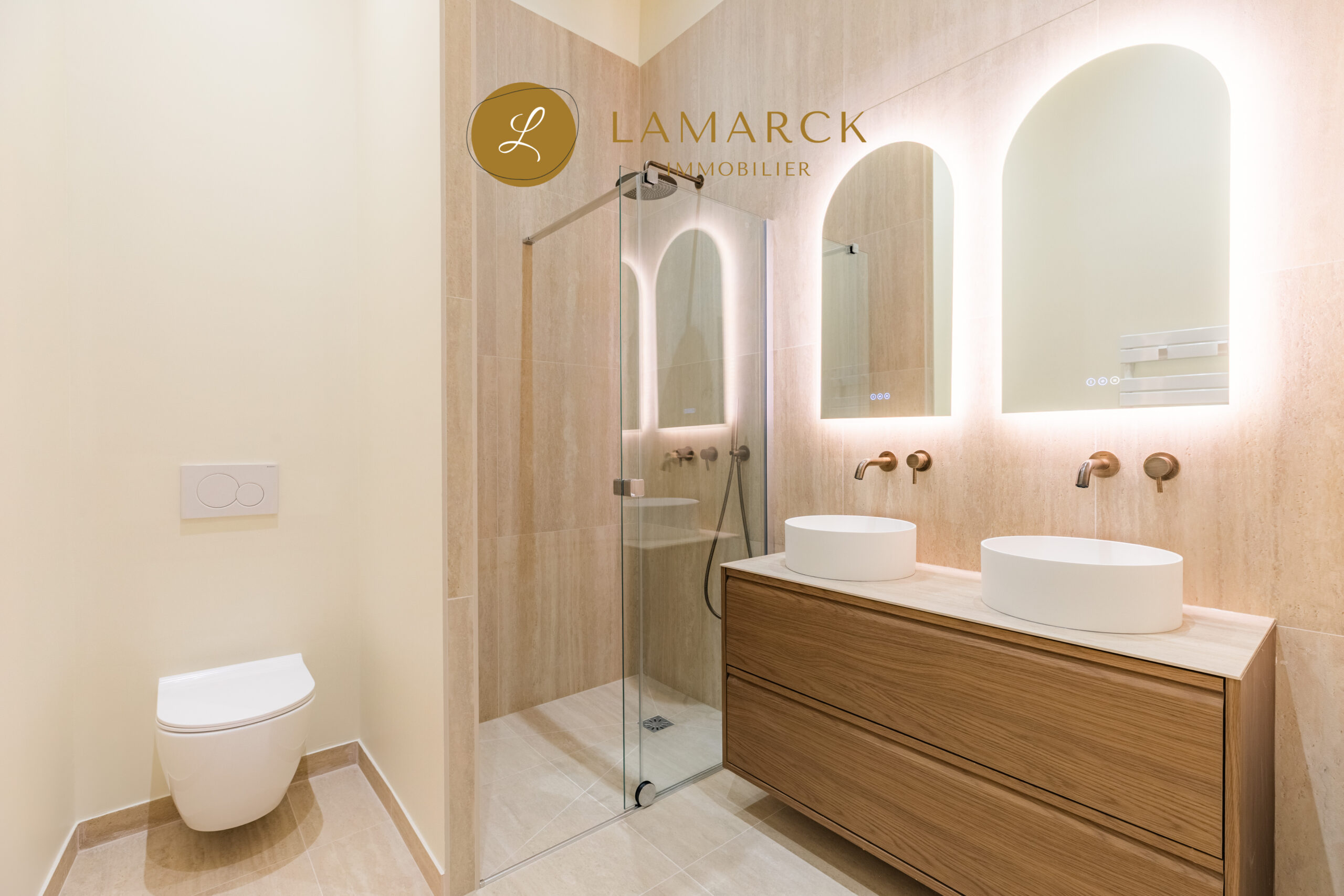 D’une surface de 105m2, ce bien au calme sur cour se compose ainsi : double-réception lumineuse, grande cuisine équipée, deux belles chambres, une buanderie, deux salles de douche, un WC invité. L’appartement lumineux dispose d’une hauteur sous plafond de 4m.